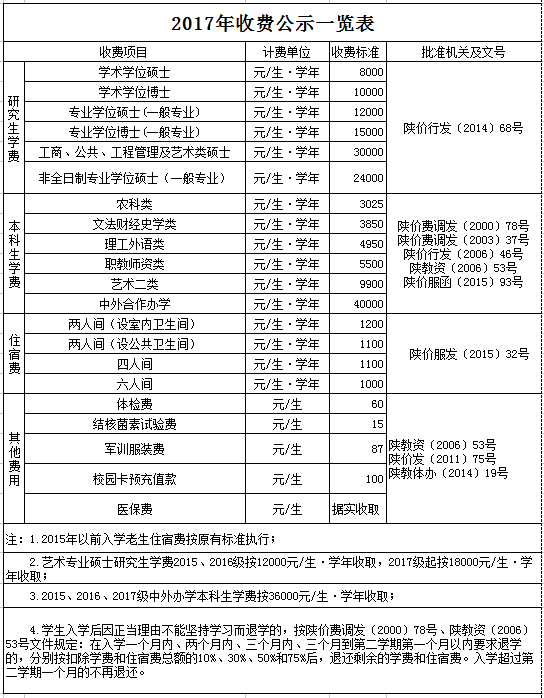 2017年收费公示一览表