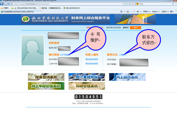 一、维护个人信息。银行信息中的工资卡和公务卡信息分别由计财处的薪金科和财务科维护,个人可再维护两张备用卡(中行卡一张、工行卡一张)。联系方式由个人自主维护,包括手机号码和电子邮箱地址。