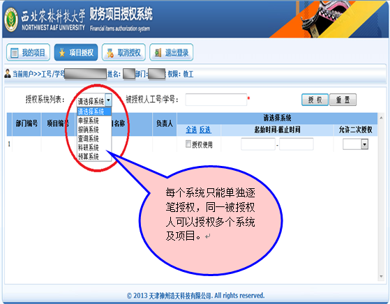 二、项目负责人操作权限包括申报系统、报账系统、查询系统、科研系统和预算系统等。项目负责人根据业务需要对被授权人进行逐项授权,并确定授权截止日期(系统默认不允许二次授权);同一项目可以对多人进行授权。