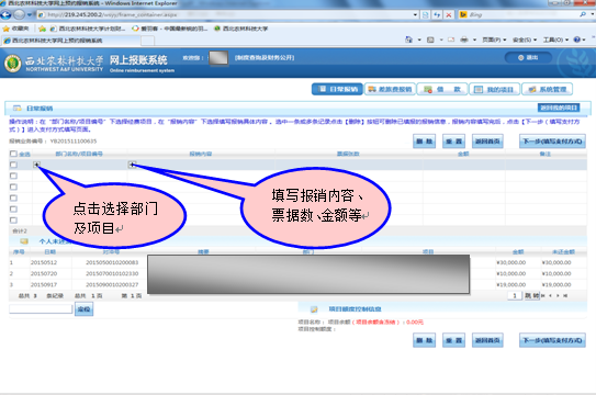 4、选择部门名称及项目编码、报销内容(关键摘要、票据数、金额)。