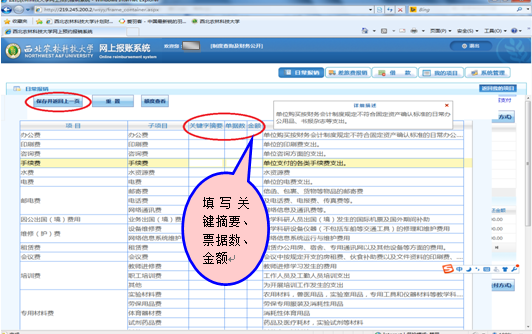 点击报销内容后,显示下图所示内容,根据具体的报销内容,在对应的项目中填写关键摘要、票据数和金额。